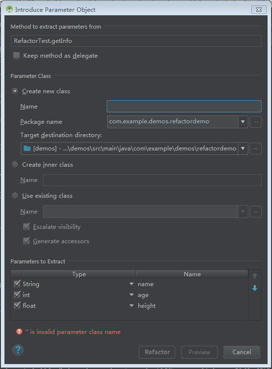 private void testExtractParamObject() { String info = getInfo("zhangshan", 20, 180f); } private String getInfo(String name, int age, float height) { return "name=" + name + ";age=" + age + ";height=" + height; }