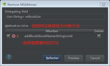 对比重构前和重构后会发现,添加book这个动作,从由BookManager的addBook方法来执行,变成了直接有mBookList来执行了。这个addBook就是这个MiddleMan,显得多余,可以优化掉。实际上优化后就变成一个inline方式了,可以对比前面讲到的“Inline”。