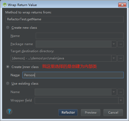 public class RefactorTest { private void testWrapReturnValue() { String name = getName().getValue(); } private Person getName() { return new Person("zhangsan"); } public class Person { private final String value; public Person(String value) { this.value = value; } public String getValue() { return value; } } }