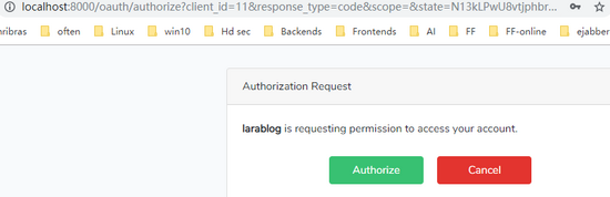 http://dev.blog.com:8000/oauth/authorize?client_id=6&response_type=code&scope=&state=SENPYyXJvT0fl4Rnz0Ag&redirect_uri=http%3A%2F%2Fdev.blog.com%3A8000%2Fauth%2Fcallback