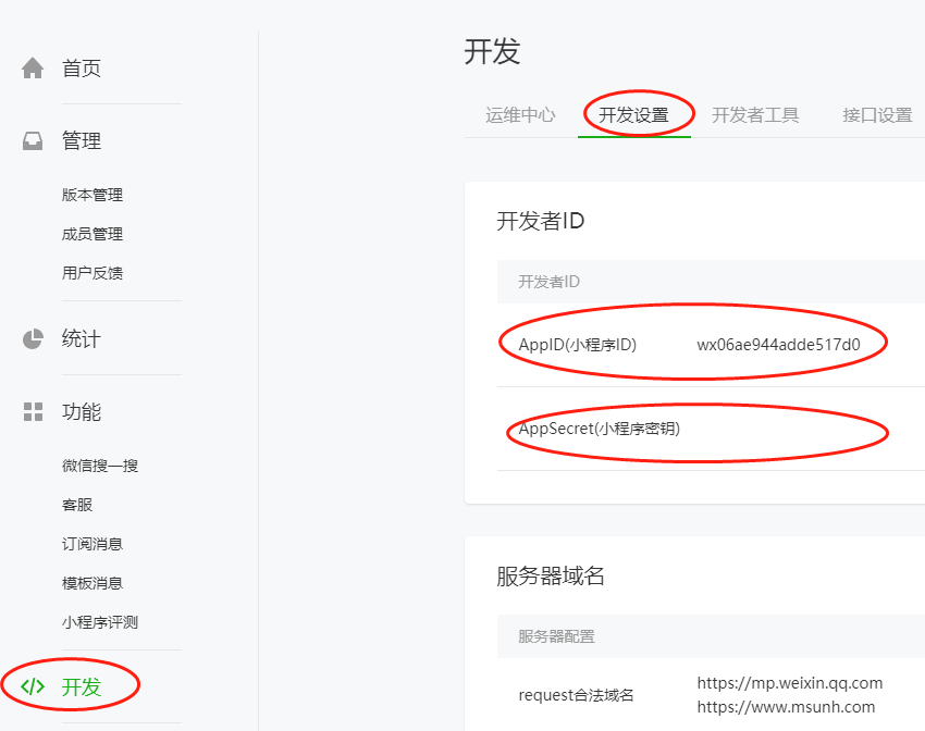 然后就是小程序的 AppId 和 AppSecret,获取方式在小程序后台的开发功能中找到开发设置,保存 ID 和秘钥。