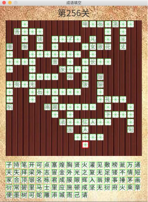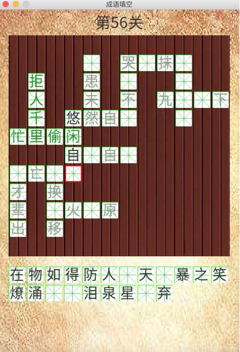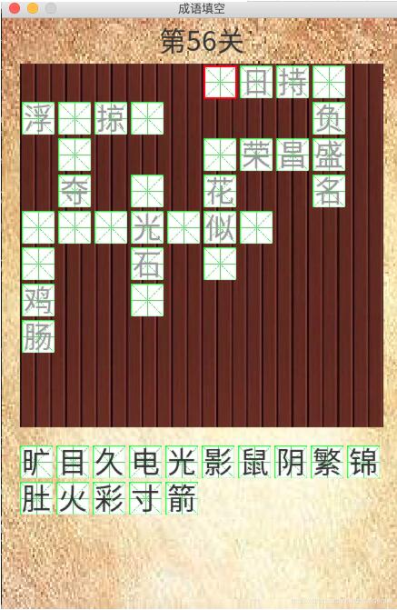 最近看到很多人玩成语填字游戏,那么先用pygame来做一个吧,花了大半天终于完成了,附下效果图。