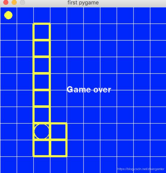 pygame.draw.circle(screen,yellow,[snake_x,snake_y],20,2)