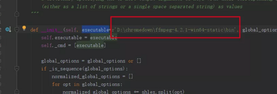 解压 ffmpeg 文件,打开 ffmpy3.py 文件(按住Ctrl键,点击ffmpy3,快速跳转到该模块),将下面代码中参数 executable 的值改为 ffmpeg.exe 可执行文件的绝对路径。