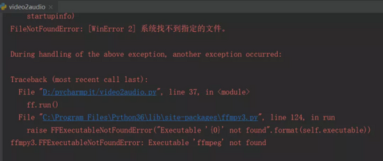 1、当你运行代码时,Windows 系统可能会出现 ffmpeg 无法找到之类的报错,如下图所示。