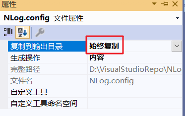 网站根目录下新建NLog.config配置文件,记得右击该文件“属性”,复制到输出目录:“始终复制”