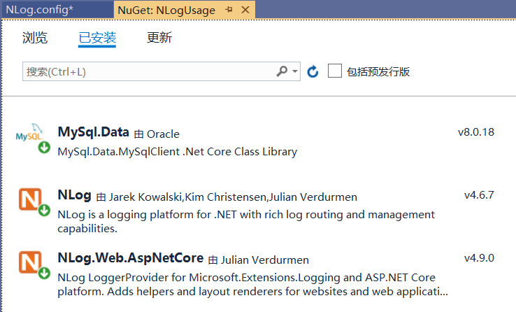 在nuget中安装NLog和NLog.Web.AspNetCore ,这两个是NLog相关的包。