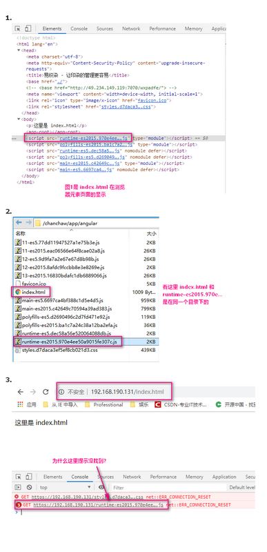 上面的 server_name 后面是 CentOS7.3 的IP地址,后面的 location 中要特别注意:try_files $uri $uri/ /index.html,这里是防止浏览器中刷新导致404,那么重点来了,部署到Nginx 后浏览器测试出现下面的问题: