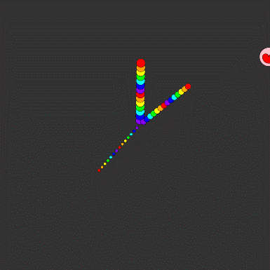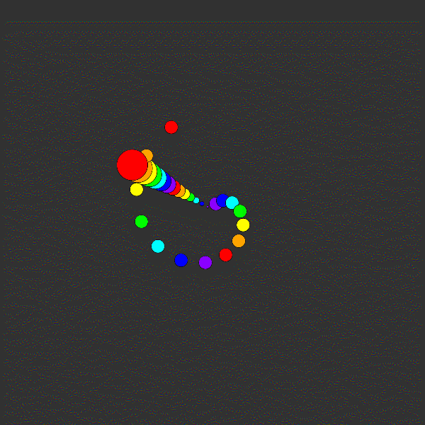1、棍状体:其实很简单,我们可以看到静止的棍状体就是由14个小圆形组成的,由外到里半径逐渐减小,然后颜色是赤橙黄绿青蓝紫,赤橙黄绿青蓝紫,每个圆形做的是绕固定圆心的匀速圆周运动。那么,我们的实现就是可以先做一个圆形的匀速圆周运动,其他的圆形,只需要修改一下旋转半径、圆形半径以及颜色就可以了。至于圆周运动怎么实现,我会在后面讲到,往后面看就可以了。