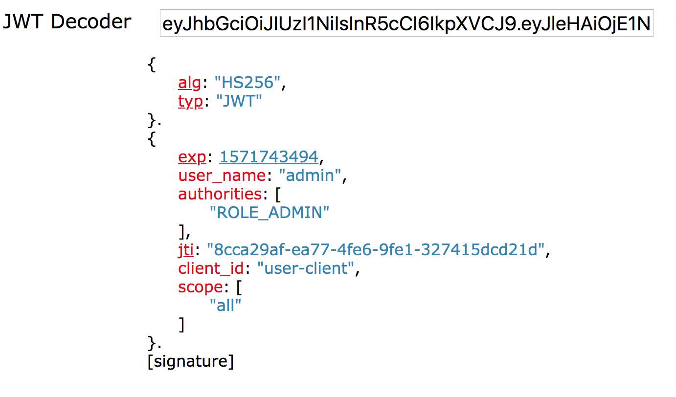 ### 解析 jwt GET http://localhost:6101/client-user/jwt Accept: */* Cache-Control: no-cache Authorization: bearer eyJhbGciOiJIUzI1NiIsInR5cCI6IkpXVCJ9.eyJ1c2VyX25hbWUiOiJhZG1pbiIsImp3dC1leHQiOiJKV1Qg5omp5bGV5L-h5oGvIiwic2NvcGUiOlsiYWxsIl0sImV4cCI6MTU3MTc0NTE3OCwiYXV0aG9yaXRpZXMiOlsiUk9MRV9BRE1JTiJdLCJqdGkiOiJhNDU1MWQ5ZS1iN2VkLTQ3NTktYjJmMS1mMGI5YjIxY2E0MmMiLCJjbGllbnRfaWQiOiJ1c2VyLWNsaWVudCJ9.5j4hNsVpktG2iKxNqR-q1rfcnhlyV3M6HUBx5cd6PiQ