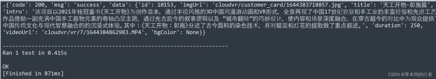 import requests import unittest import json import sys import io sys.stdout = io.TextIOWrapper(sys.stdout.buffer,encoding='utf8') #避免打印中文乱码的 class Test_api(unittest.TestCase): def setUp(self): pass def test_01_api(self): self.url = 'https://*****/video/info' self.header = {'Content-Type' : 'application/json'} #这句非常重要,有这句代码才能表示传参是json格式 self.data = { "userId" : 20, "packageId" : 1, "videoId" : 10153 } self.res = self.res = requests.post(self.url,headers=self.header,json=self.data) #一定要有header,即使header里边只标明了参数格式;json是把python的数据结构转换成json; self.r = self.res.json() print (self.r) def tearDown(self): pass if __name__=='__main__': unittest.main()
