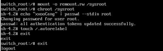 mount -o remount,rw /sysroot chroot /sysroot echo "wz123." | passwd --stdin root touch /.autorelable exit exit(reboot)