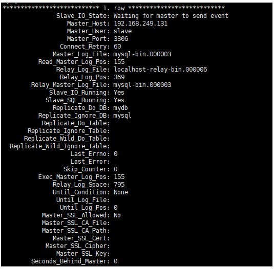 stop slave; change master to master_host='192.168.249.131',master_user='slave',master_password='000000',master_log_file='mysql-bin.000001',master_log_pos=155; start slave;
