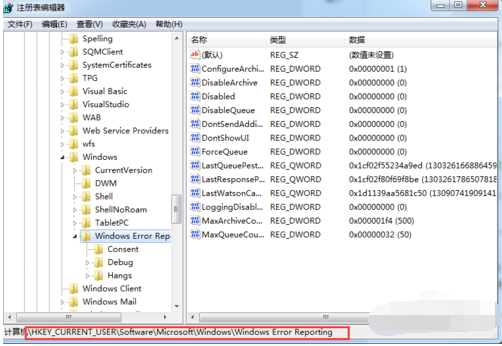 文件夹依次在登记表中展开:HKEY_CURRENT_USER-Software-Microsoft-Windows-Windows Error Reporting