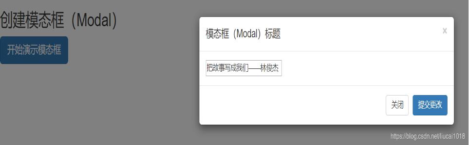 <!DOCTYPE html> <html> <head> <meta charset="utf-8"> <title>Bootstrap 实例 - 模态框(Modal)插件</title> <link href="https://cdn.staticfile.org/twitter-bootstrap/3.3.7/css/bootstrap.min.css" > <script src="https://cdn.staticfile.org/jquery/2.1.1/jquery.min.js"></script> <script src="https://cdn.staticfile.org/twitter-bootstrap/3.3.7/js/bootstrap.min.js"></script> </head> <body> <h2>创建模态框(Modal)</h2> <!-- 按钮触发模态框: class="btn btn-primary btn-lg":是指定class为"按钮的加大primary"样式 data-toggle="modal":应该是模态框的固定写法,只能为modal,至少自己试验发现是这样的 data-target="#myModal":通过选择器指向 id="myModal" 的元素,也就是要显示和隐藏的模态框目标 --> <button class="btn btn-primary btn-lg" data-toggle="modal" data-target="#myModal"> 开始演示模态框 </button> <!-- 模态框(Modal) --> <!-- class="modal fade": modal——用来把div识别成模态框 fade——当模态框被切换时,内容会淡入淡出 id="myModal":就是被指定为上面说的data-target属性选择的元素 tabindex:属性规定元素的 tab 键控制次序 aria-labelledby="myModalLabel":引用模态框的标题(去掉影响不大) aria-hidden:="true":设置模态框不可见,等到点击按钮之后显示 --> <div class="modal fade" id="myModal" tabindex="1" role="dialog" aria-labelledby="myModalLabel" aria-hidden="true"> <div class="modal-dialog"> <div class="modal-content"> <div class="modal-header"> <!-- data-dismiss="modal":加上这个,使得点击该button时会关闭模态框,下面的关闭按钮也是一样加了这个属性 --> <button type="button" class="close" data-dismiss="modal" aria-hidden="true"> × </button> <h4 class="modal-title" id="myModalLabel"> 模态框(Modal)标题 </h4> </div> <div class="modal-body"> <input type="text" placeholder="输入......"> </div> <div class="modal-footer"> <button type="button" class="btn btn-default" data-dismiss="modal">关闭</button> <button type="button" class="btn btn-primary">提交更改</button> </div> </div><!-- /.modal-content --> </div><!-- /.modal --> </div> </body> </html>