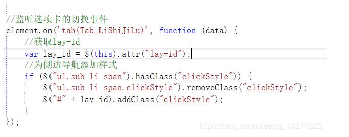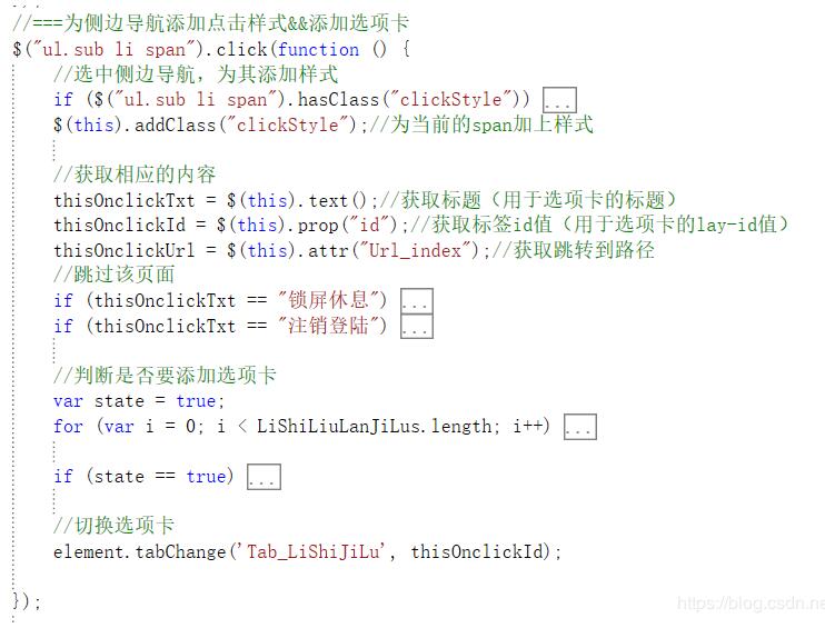 下面是为侧边导航添加点击样式以及添加选项卡的操作。该个方法就是点击侧边导航的内容触发的。