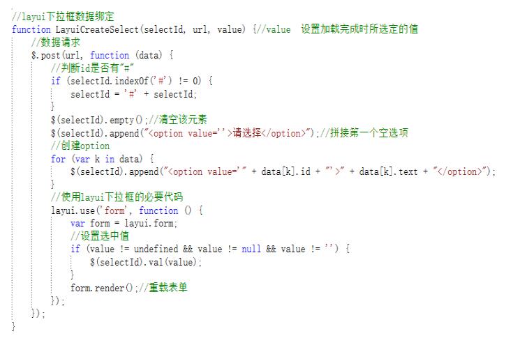 方法的参数一般有三个,一个是select标签的id,一个是查询数据的路径,还有一个是可有可无的选中值。其实方法里面就是由一个post请求构成的,构建一个动态下拉框大致分为两步,第一步请求数据,第二步把查询到的数据拼接到下拉框里。