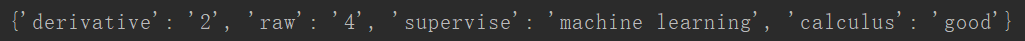 dict={'derivative':'2','raw':'4','supervise':'machine learning','calculus':'good'}