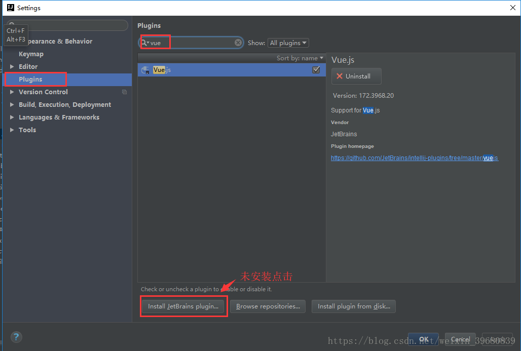 打开IDEA编辑器,快捷键Ctrl+Alt+S打开Settings(设置)------>Plugins------>搜索vue.js(图中已经安装,没有安装的点击Install JetBrains plugins...进行安装即可),安装成功后重启IDEA。