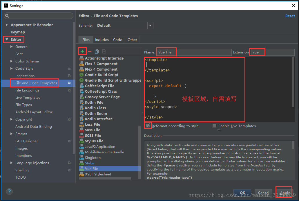 2.IDEA安装好vue.js后,接着Ctrl+Alt+S打开设置------>Editor------>File Types------>HTML,点击右侧+号,添加*.vue,最后点击Apply。