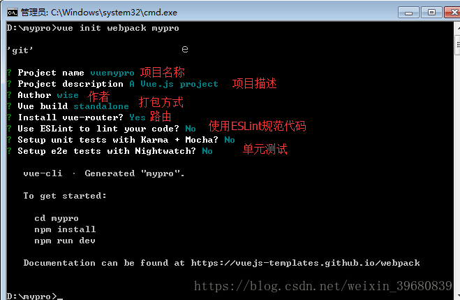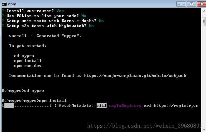 打开命令行工具cmd(Window+R),或者在IDEA中的Terminal里面进入想要构建项目的目录,输入vue init webpack mypro(mypro是自己想要构建的项目名称),回车后如下图: