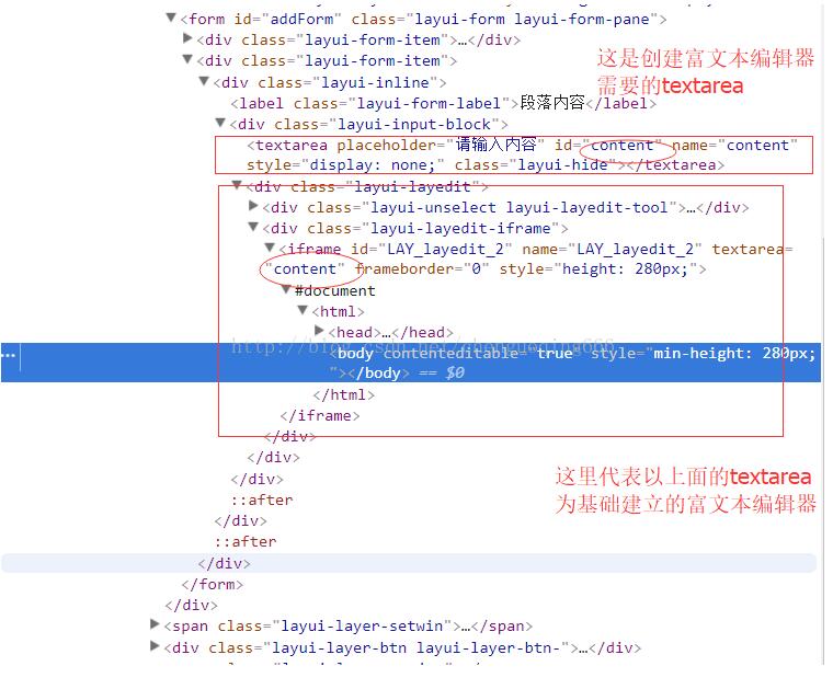 本期主要讲的是layui富文本编辑器这个东西,他的模式是在某个textarea的基础上建立了一个富文本编辑器,也就是说你填写在富文本编辑器的值其实是放在编辑器里面的,并没有放在之前的textarea中,你获取textarea的值的时候需要先把富文本编辑器的值同步到之前的textarea中,然后才能通过textarea获取对应的值
