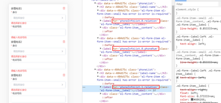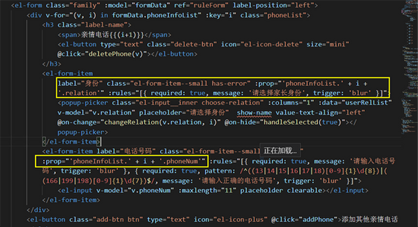 这样的rule、prop直接写就对应不上表单mode绑定的对象上的属性,所以在此要用循环的方式找到要校验的字段所在数据中的索引,然后再以字符串拼接的方式连上校验字段名称: