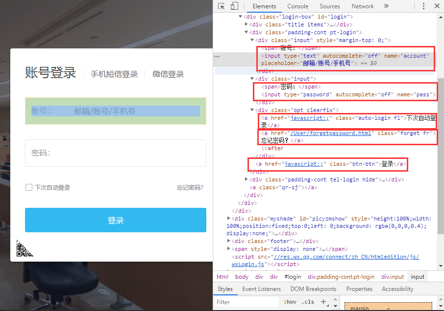 l 输入账号 //div//input[@name="account"] //div[@class="padding-cont pt-login"]//input[@placeholder="邮箱/账号/手机号"] l 输入密码 //div[@class="padding-cont pt-login"]//input[@name="pass"] //div[@class="padding-cont pt-login"]//input[@type="password"] l 下次自动登录 //div[@class="padding-cont pt-login"]//a[text()="下次自动登录"] //div[@class="padding-cont pt-login"]//a[@class="auto-login fl"] l 忘记密码 //div[@class="padding-cont pt-login"]//a[@class="forget fr"] //div[@class="padding-cont pt-login"]//a[text()="忘记密码?"] l 登录按钮 //div[@class="padding-cont pt-login"]//a[@class="btn-btn"] //div[@class="padding-cont pt-login"]//a[text()="登录"]