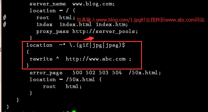 location /static/ { rewrite ^ http://www.abc.com ; } #上面实现的功能:假设网站域名为www.blog.com;那么配置上面的功能是输入www.blog.com/static/时,不管static后面是什么页面(页面也可以不存在), 那么最终会同样跳转到www.abc.com这个网站。