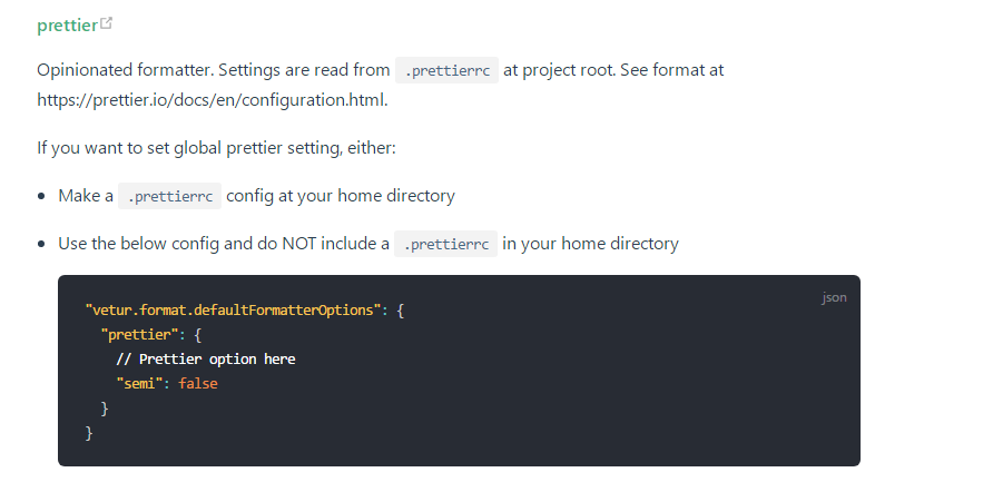 所以说有两种方法配置,一种是在根目录下写一个.prettier文件,文件里的内容可以参考网上其它文章。另一种就是如上图所示,在setting.json里配置