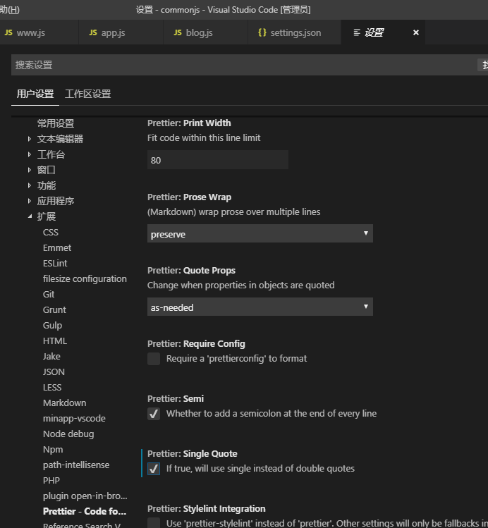 如上图,在设置勾选后配置后就会在setting.json里生成对应配置代码,不过由于Vetur的存在,此时的prettier其实并未起作用(可能是优先级问题吧,我也不清楚)