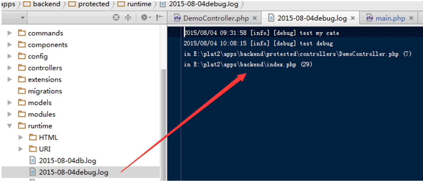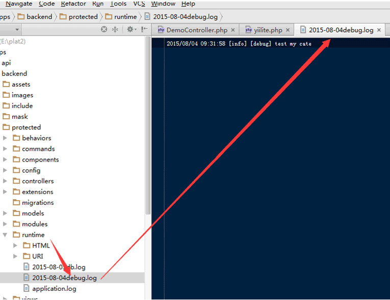 Yii::log("test my cate" , CLogger::LEVEL_INFO , "debug");'log'=>array( 'class'=>'CLogRouter', 'routes'=>array( //... array( 'class'=>'CFileLogRoute', 'levels'=>'info,trace', 'categories'=> 'debug.*', 'logFile'=> date("Y-m-d").'debug.log', ),