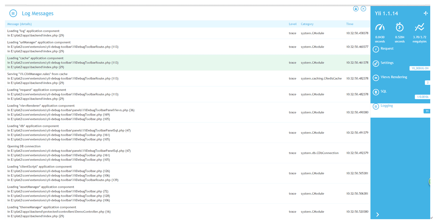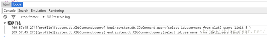 配置如下。'log'=>array( 'class'=>'CLogRouter', 'routes'=>array( array( 'class' => 'CProfileLogRoute', 'levels'=>'profile,info,trace,warning,error', ),