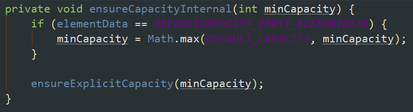 1,ensureCapacityInternal(size + 1);这个方法是判断在添加数据之前,数组的容量是否够用。这里就看下源码的实现吧。