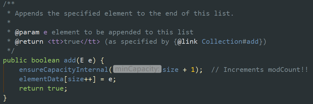 首先size默认为0,然后size+1将参数传过来。判断if (elementData == DEFAULTCAPACITY_EMPTY_ELEMENTDATA)是不是第一次添加元素,如果是,则选取默认的容量大小10,正式将数组容量初始化为10.接着调用ensureExplicitCapacity(minCapacity);这里是判断是否需要进行扩容。这里我们假设不需要扩容,接着说完add方法最后一步。
