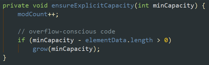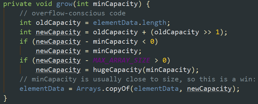上面我们说到在数组不扩容情况下元素是如何进行添加的,再来说说如何进行扩容。接着上面ensureExplicitCapacity(int minCapacity)这个方法,判断如果超出默认容量大小时,便调用grow(minCapacity);方法开始进行扩容。