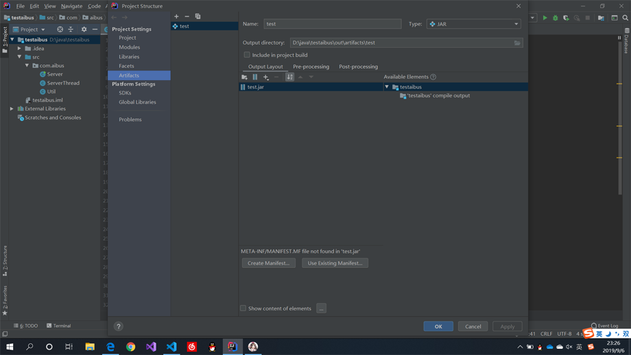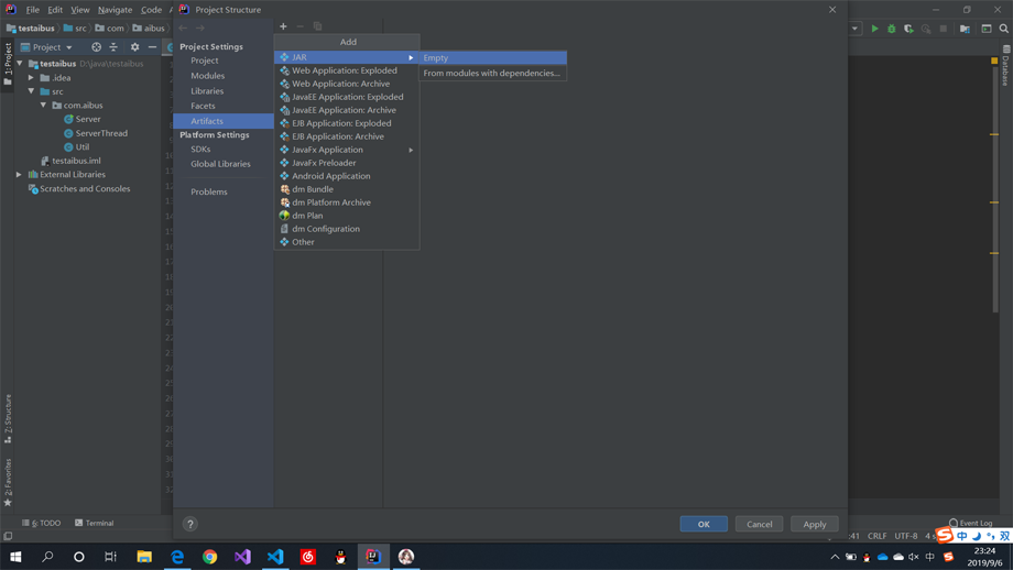 *在ProjectSetings中选择Artifects。点击+号选择jar文件中的Empty选项