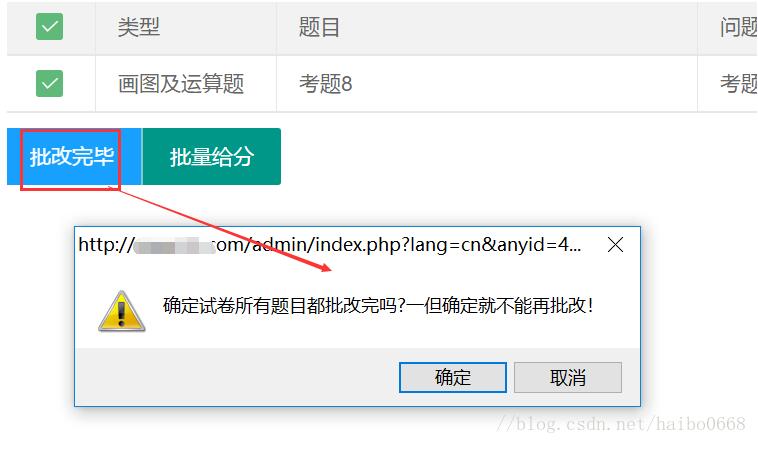 <button lay-id="{$id}" class='layui-btn layui-btn-normal correct_finish' οnclick="return confirm("确定试卷所有题目都批改完吗?一但确定就不能再批改!")">批改完毕</button>