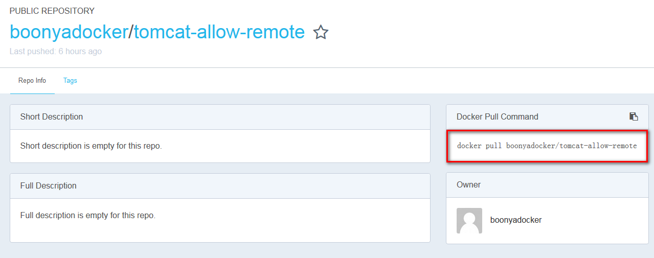 上传完成后访问:https://hub.docker.com/r/boonyadocker/tomcat-allow-remote/,如下图所示,大家都可以使用我发布的镜像了:
