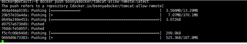 docker@default:~$ docker push boonyadocker/tomcat-allow-remote:latest The push refers to a repository [docker.io/boonyadocker/tomcat-allow-remote] 464a44ea0195: Layer already exists 29b57e33a4da: Pushed d649a240e453: Layer already exists d0757a6730d0: Layer already exists 768dcfe5d05f: Layer already exists f5cfc06b640d: Layer already exists 9669d6b73383: Layer already exists latest: digest: sha256:1e7562a15ef1728f213922d9633be67f3025447d0a641e333a8ec5107749c386 size: 11802 docker@default:~$