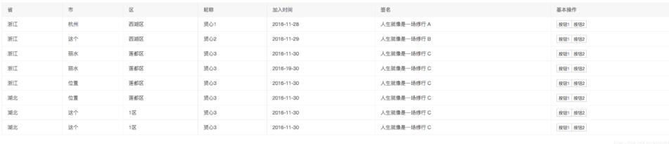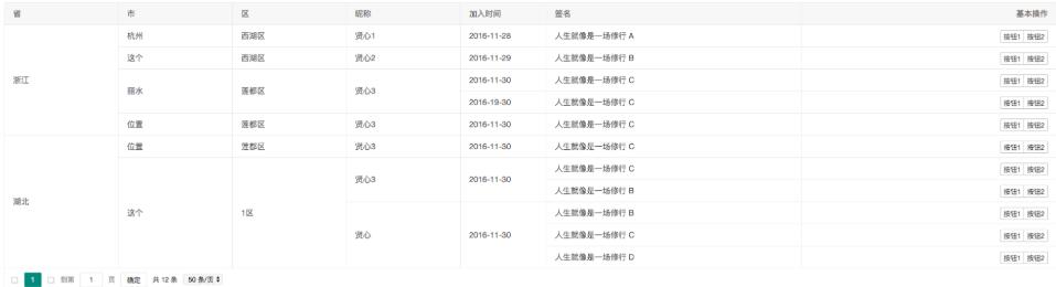 在数据表格中,对于按某个分类展示数据其分类下又有多个细分的嵌套细分项,如省市区昵称,省下面有多个市,市下面有多个区,区下面有昵称,需要实现跨行合并,且操作按钮以分类为单位(即操作按钮需按照分类合并)。