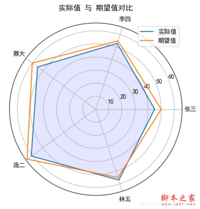 #python 3.7.4,opencv4.1 #蔡军生 https://blog.csdn.net/caimouse/article/details/51749579 # import matplotlib.pyplot as plt import numpy as np plt.rcParams['font.sans-serif']=['SimHei'] #用来正常显示中文标签 plt.rcParams['axes.unicode_minus']=False #用来正常显示负号 employee = ["张三", "李四", "蔡大", "庞二", "林五"] actual = [45, 53, 55, 61, 57, 45] expected = [50, 55, 60, 65, 55, 50] # 设置图形大小和极坐标方式显示 plt.figure(figsize=(5, 5)) plt.subplot(polar=True) #角度坐标生成 theta = np.linspace(0, 2 * np.pi, len(actual)) # 设置极坐标的标记 lines, labels = plt.thetagrids(range(0, 360, int(360/len(employee))), (employee)) # 在极坐标显示销售数值 plt.plot(theta, actual) plt.fill(theta, actual, 'b', alpha=0.1) # 极坐标显示期望销售数值 plt.plot(theta, expected) # 添加标注和标题 plt.legend(labels=('实际值', '期望值'), loc=1) plt.title("实际值 与 期望值对比") # 显示点到屏幕 plt.show()