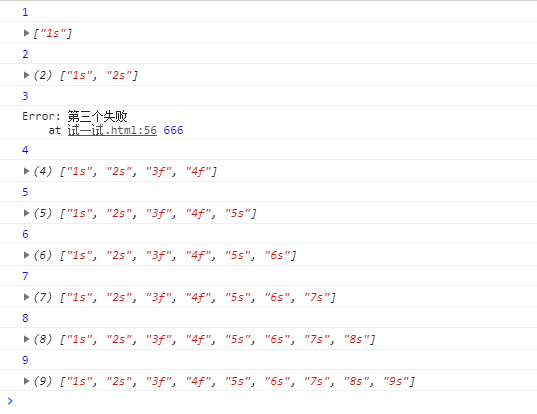 //定义初始数据 requestlist就像tabBar列表 let requestlist = [1, 2, 3, 4, 5, 6, 7,8,9]; //每个tabBar的返回数据使用reslist装起来 let reslist = []; function startapi() { //定义counts,用来收集请求的次数,(也可以用reslist的length进行判断) let counts = 0; return function apirequest() { let arg =arguments[0] let a = new Promise((res, rej) => { //setTimeout模拟请求到接收的时间需要5秒钟 setTimeout(function () { res('成功返回数据'); },100) }) //无论成功或者失败都要进行下一次,以免阻塞,成功请求的末尾有s标志,失败的末尾有f标志 a.then(() => { counts++; if (counts > requestlist.length) { return; } console.log(counts) //1,假设当前请求出错的时候我们认为这不合法,假设此时counts为3 if(counts==3){ throw new Error('第三个失败') } //2,假设当前请求下没有数据的时候我们认为不合法 ,假设此时counts为4 if(counts==4){ reslist.push(arg + 'f'); } if(counts!=4){ reslist.push(arg + 's'); } apirequest(requestlist[counts]) console.log(reslist) }).catch(err => { reslist.push(arg + 'f'); //递归调用 apirequest(requestlist[counts]) console.log(err) }) } } let newapiget = startapi(); newapiget(requestlist[0])