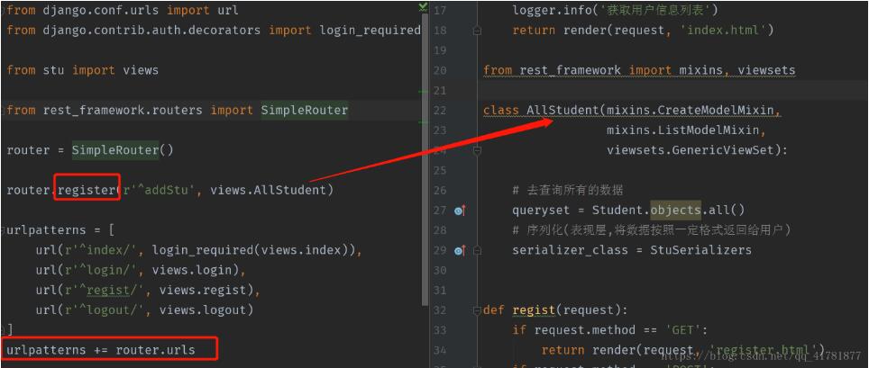 from stu import views from rest_framework.routers import SimpleRouter router = SimpleRouter() router.register(r'student', views.StudentEdit) urlpatterns = [ # 其他url ] urlpatterns += router.urls #这里表示添加定义的url