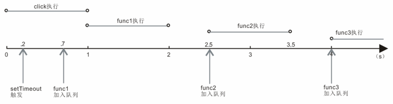 用setTimeout方法的话,上面假设的场景就发生了改变,如下图所示,在0s处触发click事件,click事件执行,在0.2s处触发定时器,0.7s处第一个函数func1加入到事件队列,click事件执行了1s,在1s处func1执行,2s处func1执行结束,第二个setTimeout定时器才被触发,0.5s后将函数func2加入队列,此时队列为空,func2开始执行,3.5s处func2执行结束,又一个setTimeout定时器被触发,0.5s后将函数func3加入队列,此时队列为空,func3开始执行。。。