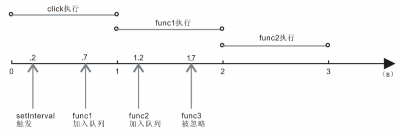 一图胜千言,如下图所示,让我们跟着时间线看看这样的问题怎么发生的。假定一个场景,在click事件中设置了setInterval(func,500),假设click事件和定时器内函数的执行时间都是1s,为了方便陈述,我把不同时间触发的func取了不同的名字,实际上接下来的func1=func2=func3=func。在0s处触发click事件,click事件执行,在0.2s处触发定时器,0.7s处第一个函数func1加入到事件队列,但由于JS引擎是单线程的,click事件还在执行,所以func1等待着,等到1s处,click事件执行完毕,fun1才开始执行。按照定时器的时间间隔,1.2s处第二个函数func2加入到事件队列,但此时fun1正在执行,所以func2只能等待。0.5s后,也就是1.7s处,第三个函数func理应加入事件队列,但是JS引擎做了一个事情: