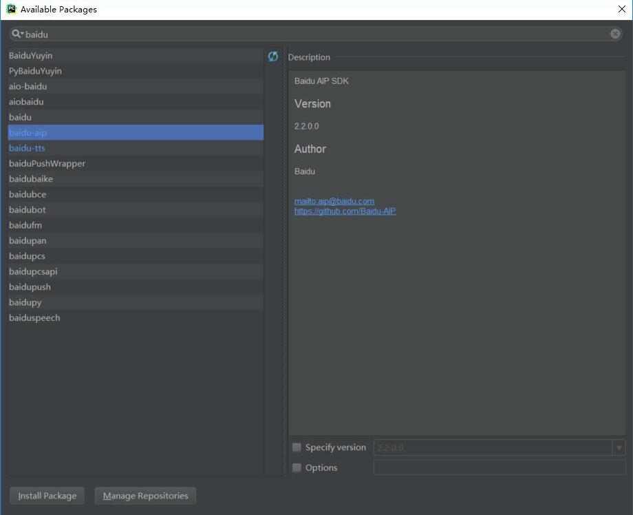如果在pycharm里也可以在setting----Project Interpreter---右边绿色加号,输入baidu,安装baidu-aip