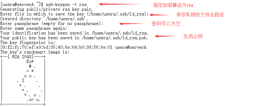 [usera@serverA ~]$ ssh-keygen -t rsa Generating public/private rsa key pair. Enter file in which to save the key (/home/usera/.ssh/id_rsa): Created directory '/home/usera/.ssh'. Enter passphrase (empty for no passphrase): Enter same passphrase again: Your identification has been saved in /home/usera/.ssh/id_rsa. Your public key has been saved in /home/usera/.ssh/id_rsa.pub. The key fingerprint is: 39:f2:fc:70:ef:e9:bd:05:40:6e:64:b0:99:56:6e:01 usera@serverA The key's randomart image is: +--[ RSA 2048]----+ | Eo* | | @ . | | = * | | o o . | | . S . | | + . . | | + . .| | + . o . | | .o= o. | +-----------------+