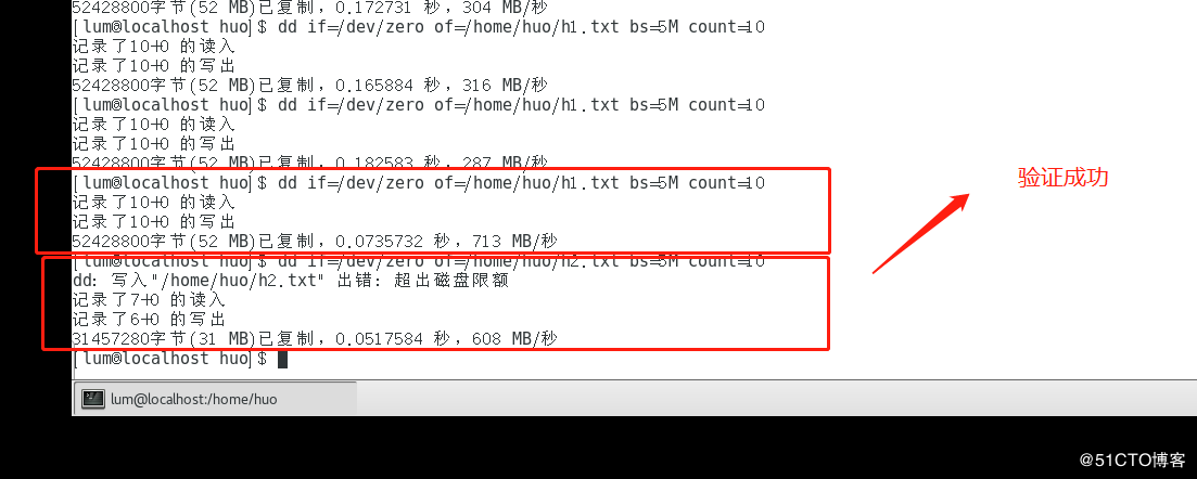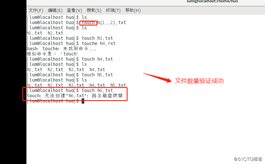 验证磁盘配额(注意,此限制针对的是用户lum,所以需要切换用户)