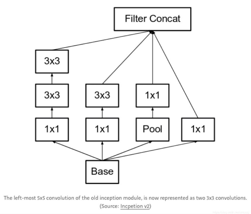 inception V2中将5x5的卷积改为2个3x3的卷积,扩大了感受野,原来是5x5,现在是6x6。Pytorch实现GoogLeNet(inception V2):
